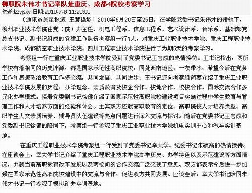 柳州教育网发布我院党委书记朱伟才率队赴重庆、成都4院校考察学习的新闻 来源:柳州职业技术学院新闻网 作者:朱汝群 编审: 发布时间:2010-07-09 浏览次数: 次 【字体:小 大】 分享到: 柳州教育网2010年7月8日发布我院党委书记朱伟才率队赴重庆、成都4院校考察学习的新闻。(图/朱汝群) 教育网发布我院新闻的截图 关闭 打印正文