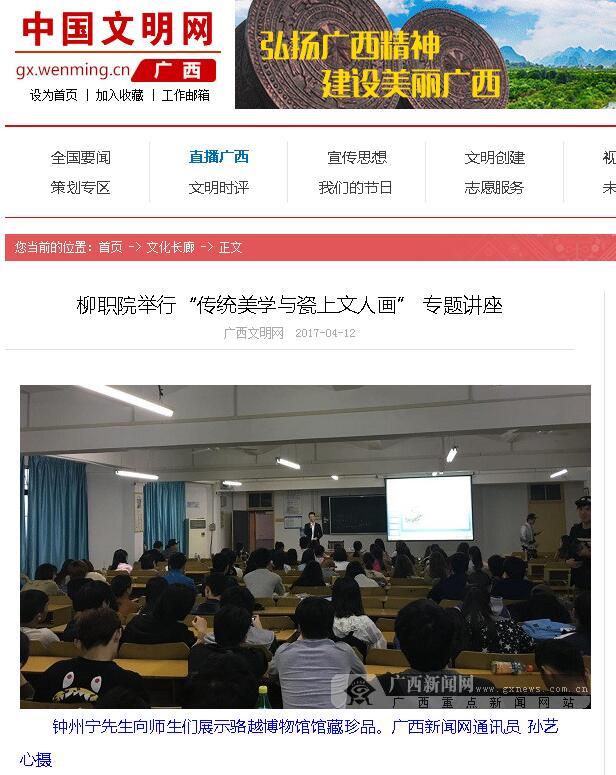2017年4月12日,中国文明网刊发我校举行“传统美学与瓷上文人画”专题讲座的新闻。详情点击:http://gx.wenming.cn/whcl/201704/t20170412_4175067.htm(截图:石玉丹)