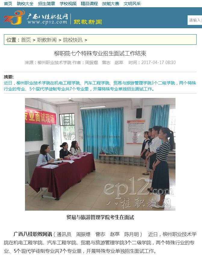 2017年4月17日,广西八桂职教网在职教新闻-院校快讯栏目中,刊发我校举行七个特殊专业招生面试的新闻。详情点击:http://www.ep12.com/a/zhijiaoxinwen/kuaixun/2017/0417/45901.html (截图:石玉丹)