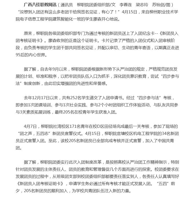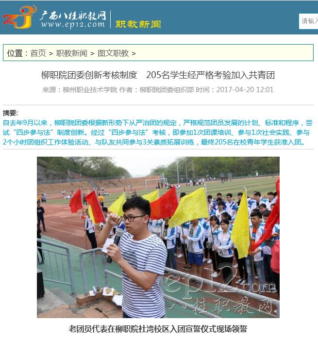 2017年4月20日,广西八桂职教网在职教新闻-图文职教栏目中,刊发我校团委创新考核制度,205名学生经严格考验加入共青团的新闻。详情点击:http://www.ep12.com/a/zhijiaoxinwen/tuwenzhijiao/2017/0420/45976.html(截图:石玉丹)