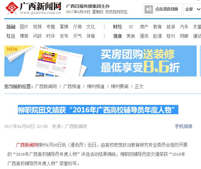 2017年4月30日,广西新闻网在广西频道-柳州频道-柳州要闻栏目刊发我?;绻こ萄г焊ǖ荚碧镂逆夯竦谩?016年广西高校辅导员年度人物”的新闻。详情点击: http://lz.gxnews.com.cn/staticpages/20170430/newgx5905ee0d-16147684.shtml (截图:石玉丹)