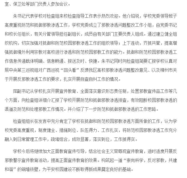 2017年4月27日,广西新闻网在广西频道-柳州频道-柳州要闻栏目中,刊发我校迎来柳州市反邪教渗透工作专项检查组的新闻。详情点击:http://lz.gxnews.com.cn/staticpages/20170427/newgx5901f6b9-16141465.shtml (截图:石玉丹)