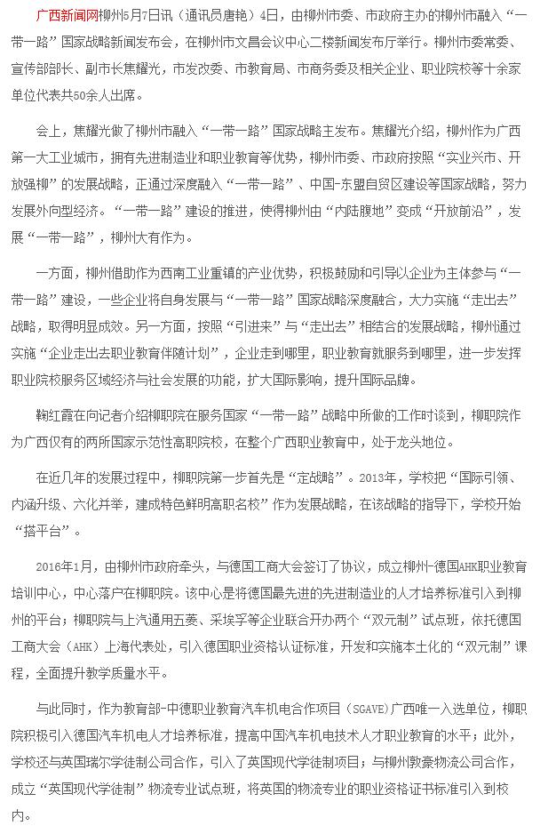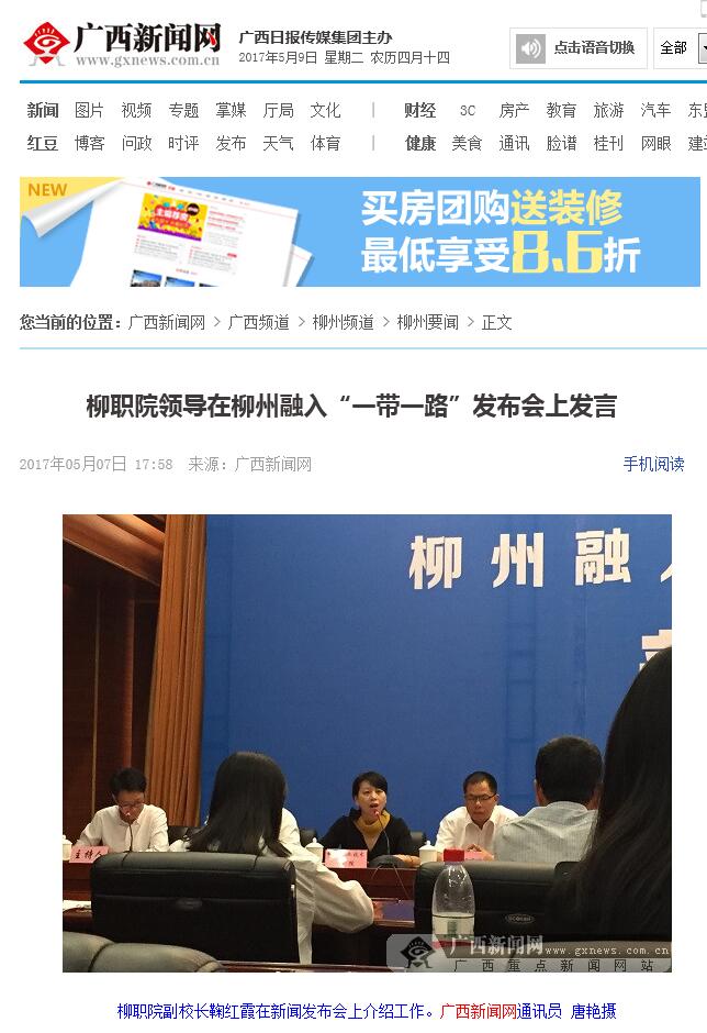 2017年5月7日,广西新闻网在广西频道-柳州频道-柳州要闻栏目,刊发我校副校长鞠红霞在柳州融入“一带一路”新闻发布会上发言的新闻。详情点击: http://lz.gxnews.com.cn/staticpages/20170507/newgx590eefc5-16165393.shtml(截图:石玉丹)
