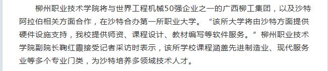 2017年5月9日,中国新闻网刊发我校将与柳工在沙特合建第一所职业大学的新闻。详情点击:http://www.chinanews.com/cj/2017/05-08/8218559.shtml(截图:石玉丹)