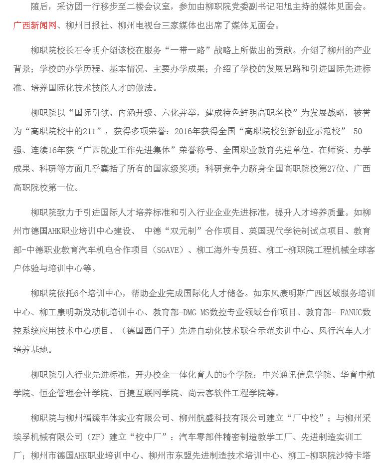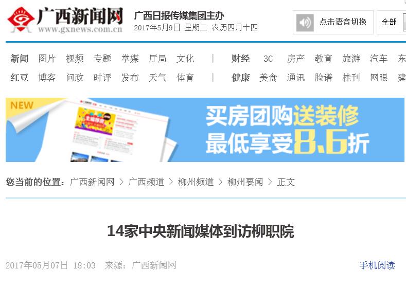 2017年5月7日,广西新闻网在广西频道-柳州频道-柳州要闻栏目中,刊发14家中央新闻媒体到我校官塘校区采访的新闻。 http://lz.gxnews.com.cn/staticpages/20170507/newgx590ef0fa-16165407.shtml (截图:石玉丹)