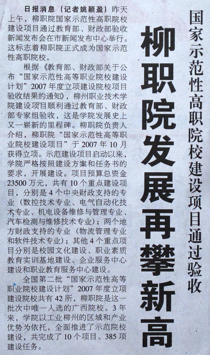 据报道,全国第二批“国家示范性高等职业院校建设计划”2007年度立项建设院校共有42所,柳州职业技术学院是该批次中唯一入选的广西院校。(文、图/蒋玉梅)
