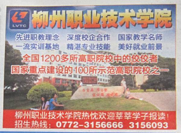 《南国今报》头版发布我院招生信息 来源:柳州职业技术学院新闻网 作者:朱汝群 编审: 发布时间:2010-07-29 浏览次数: 次 【字体:小 大】 分享到: 2010年7月29日,《南国今报》在头版报眼位置发布我院招生信息,此信息将在该报8月3日的头版重新发布。(图/朱汝群) 《南国今报》发布我院招生信息截图 关闭 打印正文