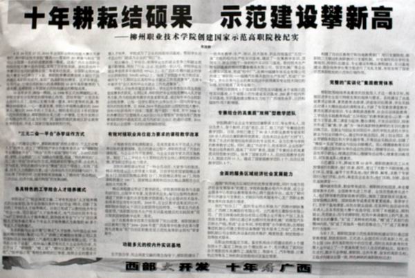 2010年8月2日,《广西日报》要闻版刊登题为《十年耕耘结硕果 示范建设攀新高——柳州职业技术学院创建国家示范高职院校纪实》的文章,报道了我院创建国家示范高职院校的历程及取得的显著成效。(图/朱汝群)