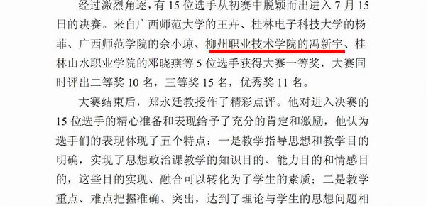 2010年第26期《广西教育工作简报》发布我院教师冯新宇在全区第二届高校思想政治理论课青年教师教学基本功大赛中获一等奖的信息。(图/朱汝群)