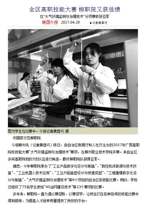 2017年4月29日,南国今报在第2版,以“全区高职技能大赛 柳职院又获佳绩”为题,刊发我校学子在2017年广西高职院校技能大赛“大气环境监测与治理技术”赛项斩获亚军的新闻。详情可点击http://epaper.gxnews.com.cn/ngjb/html/2017-04/29/content_2846196.htm(截图:唐艳)