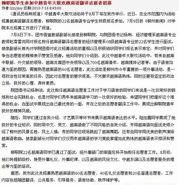 柳州教育网发布我院学生参加中越青年大联欢越南语翻译志愿者招募的信息 来源:柳州职业技术学院新闻网 作者:蒋玉梅 编审: 发布时间:2010-07-22 浏览次数: 次 【字体:小 大】 分享到: 2010年7月16日,柳州教育网发布我院学生参加中越青年大联欢越南语翻译志愿者招募的信息。(图/蒋玉梅) 柳州教育网发布我院信息的截图 关闭 打印正文