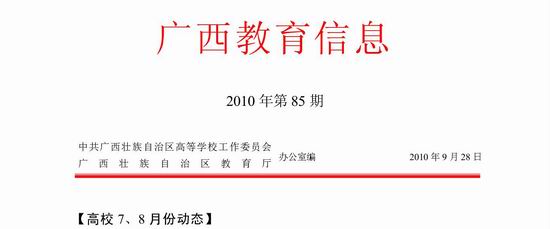《广西教育信息》2010年第85期发布“柳工-柳职院工程机械售后服务专业培训班”在我院开班的信息。(图/朱汝群)