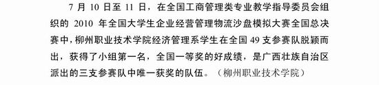 《广西教育信息》2010年第86期发布我院学生获2010年全国大学生企业经营管理物流沙盘模拟大赛全国总决赛一等奖的信息。(图/朱汝群)