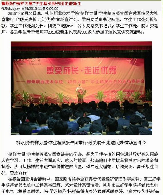 柳州教育网发布我院“榜样力量”学生精英报告团走进新生的信息 来源:柳州职业技术学院新闻网 作者:蒋玉梅 编审: 发布时间:2010-11-09 浏览次数: 次 【字体:小 大】 分享到: 2010年11月5日,柳州教育网发布我院“榜样力量”学生精英报告团走进新生的信息。(图/蒋玉梅) 柳州教育网发布我院信息的截图 关闭 打印正文