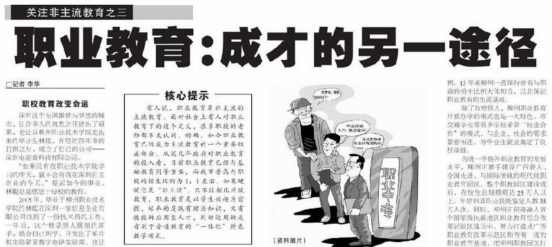该报道为“关注非主流教育”系列报道之三,以《职业教育:成才的另一途径》为题,其中对我院党委书记朱伟才进行了采访报道,还将我院优秀毕业生林聪成功创业的事迹作为职业教育改变命运的典型。报道称: