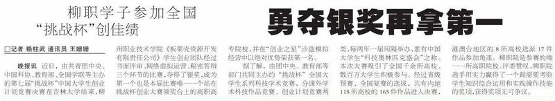 《柳州晚报》报道我院学生参加全国“挑战杯”创佳绩的新闻 来源:柳州职业技术学院新闻网 作者:蒋玉梅 编审: 发布时间:2010-10-15 浏览次数: 次 【字体:小 大】 分享到: 2010年10月11日,《柳州晚报》报道我院学生参加全国“挑战杯”创佳绩的新闻。(图/蒋玉梅) 《柳州晚报》报道我院新闻的截图 关闭 打印正文