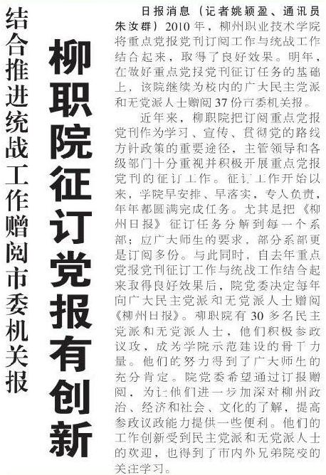 《柳州日报》报道我院征订党报有创新 来源:柳州职业技术学院新闻网 作者:蒋玉梅 编审: 发布时间:2010-12-27 浏览次数: 次 【字体:小 大】 分享到: 2010年12月25日,《柳州日报》报道我院征订党报有创新。(图/蒋玉梅) 《柳州日报》报道我院新闻的截图 关闭 打印正文