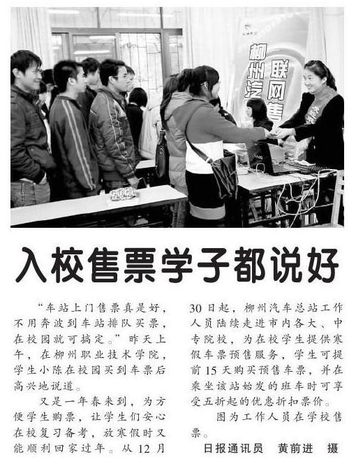 2010年12月31日,《柳州日报》报道汽车站工作人员走进我院售票方便学子的新闻。