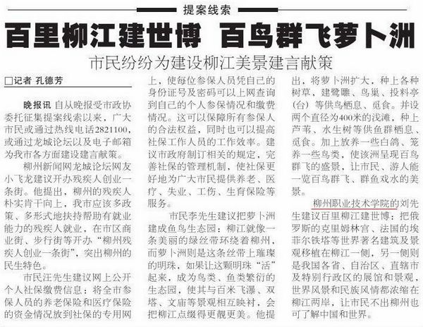 2011年1月20日,《柳州晚报》报道我院教职工为建设柳江美景建言献策的新闻。(图/蒋玉梅)