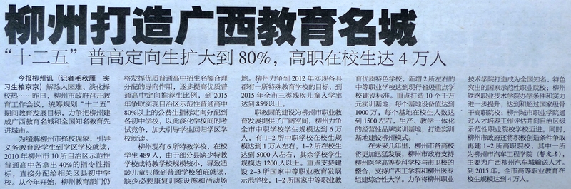 《南国今报》报道柳州“十二五”期间教育发展目标时提到我院