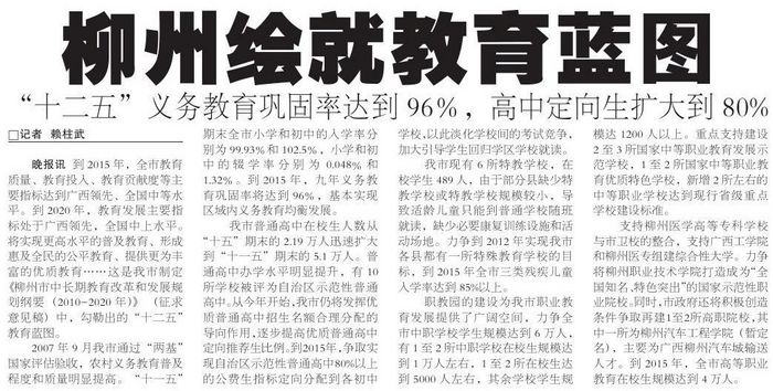 将实现更高水平的普及教育 、形成惠及全民的公平教育 、提供更为丰富的优质教育……这是我市制定《柳州市中长期教育改革和发展规划纲要(2010-2020年)》(征求意见稿)中 ,勾勒出的“十二五”教育蓝图。