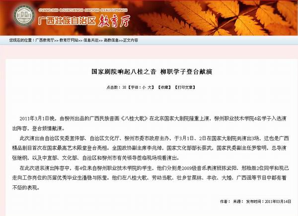 广西壮族自治区教育厅网站2011年3月14日发布我院学子参演《八桂大歌》,在国家大剧院登台倾情献演的新闻。(文、图/朱汝群)