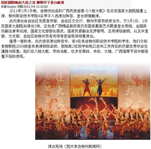 柳州教育网发布我院学子登上国家剧院献演的信息 来源:柳州职业技术学院新闻网 作者:蒋玉梅 编审: 发布时间:2011-03-09 浏览次数: 次 【字体:小 大】 分享到: 2011年3月8日,柳州教育网发布我院学子登上国家剧院献演的信息。(图/蒋玉梅) 柳州教育网发布我院信息的截图 关闭 打印正文