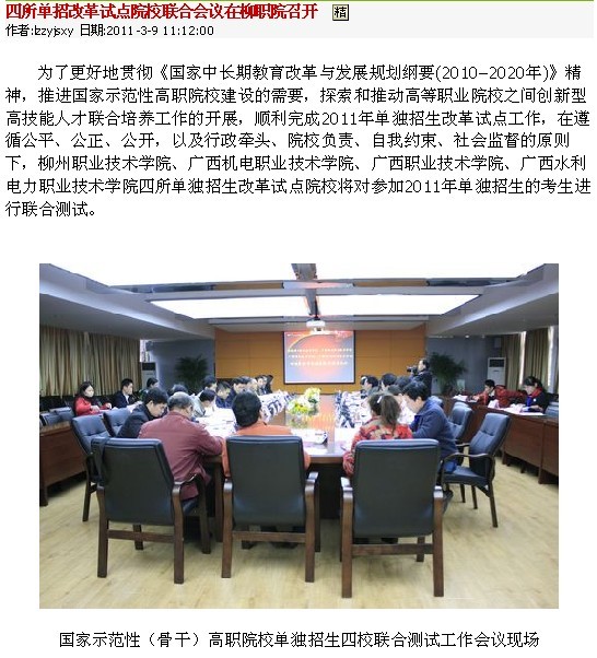 柳州教育网发布四所单独招生改革试点院校联合会议在我院召开的信息 来源:柳州职业技术学院新闻网 作者:蒋玉梅 编审: 发布时间:2011-03-10 浏览次数: 次 【字体:小 大】 分享到: 2011年3月9日,柳州教育网发布四所单独招生改革试点院校联合会议在我院召开的信息。(图/蒋玉梅) 柳州教育网发布我院信息的截图 关闭 打印正文