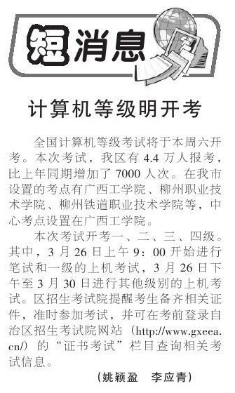 2011年3月25日,《柳州日报》报道全国计算机等级考试将在我院举行的消息。(蒋玉梅)