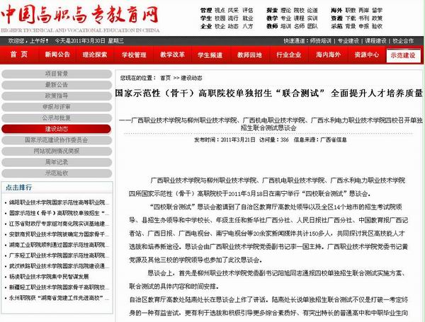 2011年3月21日,中国高职高专教育网报道我院与其他3所广西国家示范性(骨干)高职院校召开单独招生联合测试恳谈会,共同探讨全区高技能人才选拔和培养新途径,全面提升人才培养质量。(朱汝群)