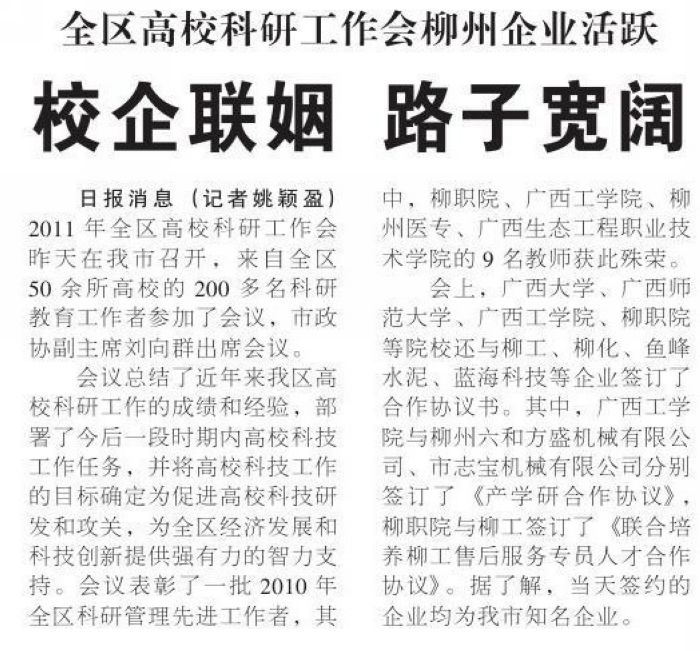 2011年4月12日,《柳州日报》报道我院承办的2011年全区高校科研工作会议召开的新闻。(蒋玉梅)