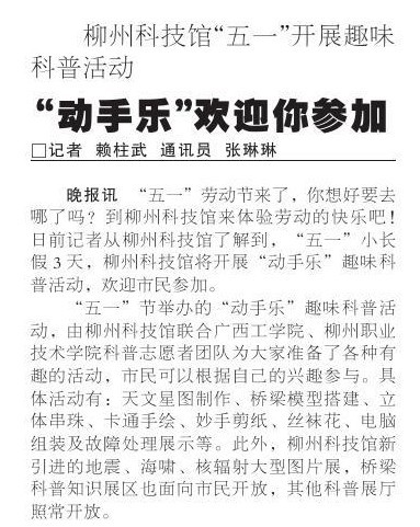 2011年4月30日,《柳州晚报》报道我院志愿者参加柳州市科普活动的新闻。
