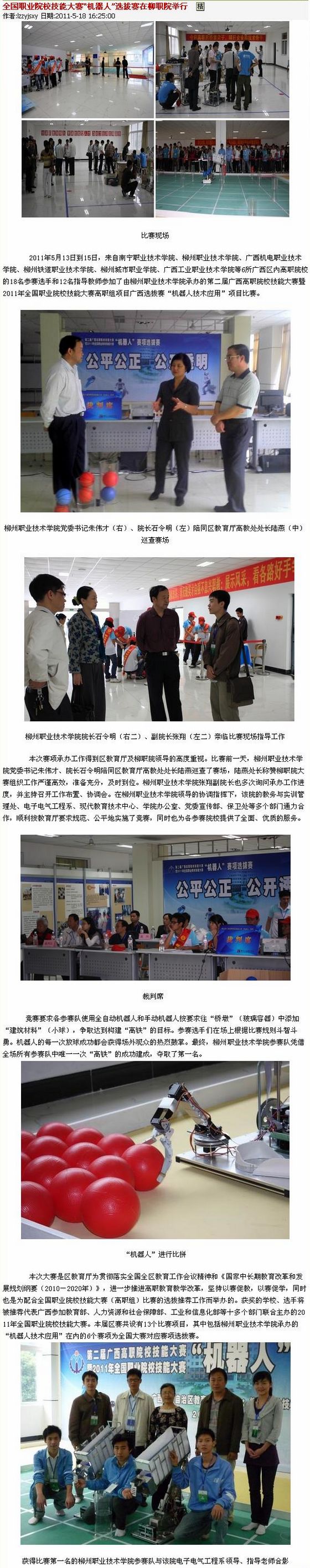 柳州教育网发布全国职业院校技能大赛“机器人”选拔赛在我院举行的信息 来源:柳州职业技术学院新闻网 作者:蒋玉梅 编审: 发布时间:2011-05-20 浏览次数: 次 【字体:小 大】 分享到: 2011年5月18日,柳州教育网发布全国职业院校技能大赛“机器人”选拔赛在我院举行的信息。(图/蒋玉梅) 柳州教育网发布我院信息的截图 关闭 打印正文