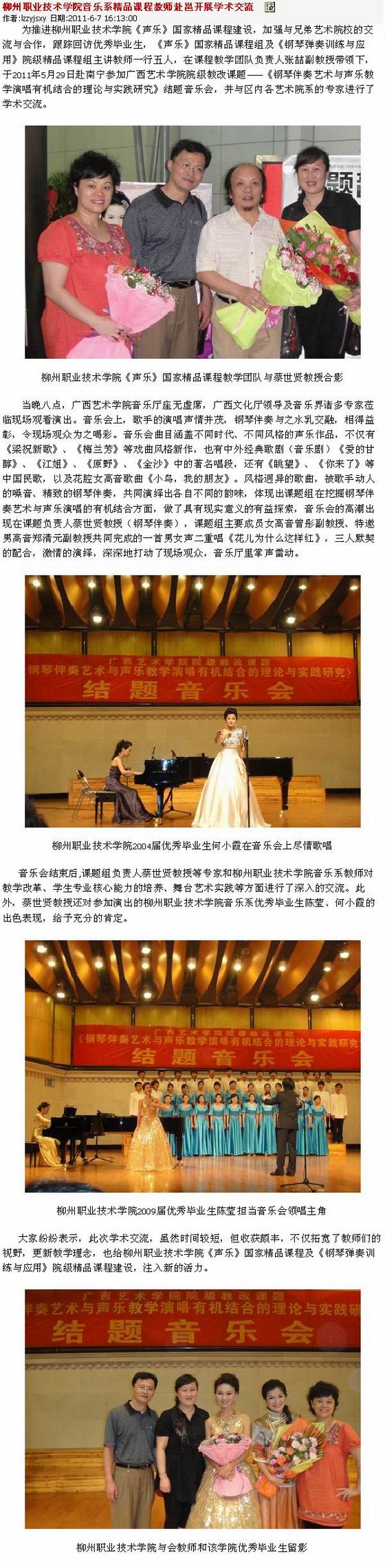 2011年6月7日,柳州教育网发布我院音乐系精品课程教师赴邕开展学术交流的信息。(图/蒋玉梅)