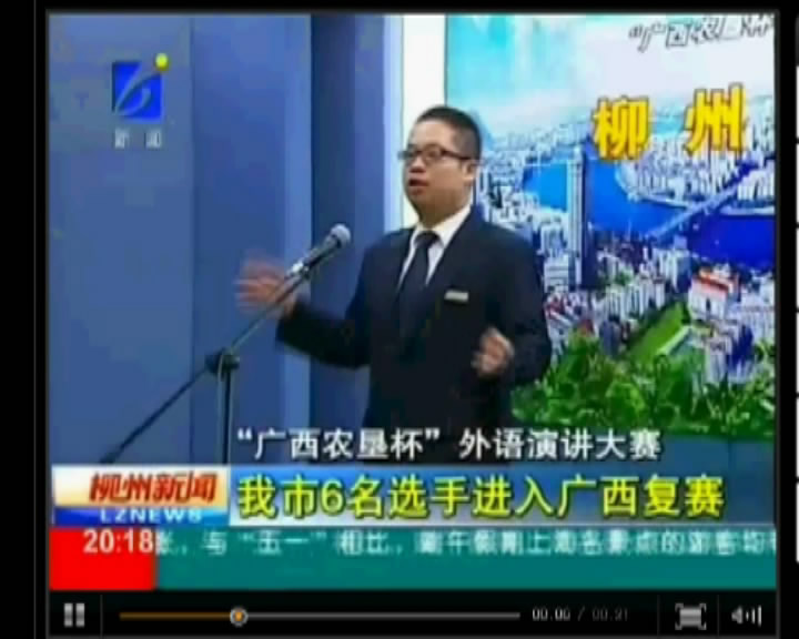 柳州电视台报道我院选手参加全区外语演讲大赛进入复赛的新闻 来源:柳州职业技术学院新闻网 作者:朱汝群 编审: 发布时间:2011-06-08 浏览次数: 次 【字体:小 大】 分享到: 2011年6月6日,柳州电视台《柳州新闻》栏目报道我院选手参加“广西农垦杯”外语演讲大赛进入复赛的新闻。(图/朱敬民) 《柳州新闻》栏目播出我院新闻的截图 关闭 打印正文