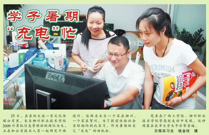 25日,在东环大道一家文化传媒公司里,来自柳州职业技术学院2009计算机信息管理班的两位女生,正在和公司技术人员一起研究平面设计。这两名女生一个家在柳州、一个家在贺州,为了提前体验社会实际相约到此实习,作为暑期给自己“充电”的好机会。