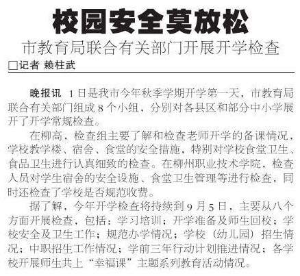 2011年9月3日,《柳州晚报》报道柳州市教育局领导到我院开展开学检查工作的新闻。