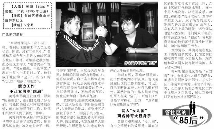 “当时就像闯入‘女儿国’一样,看到社区里的工作人员全是姐姐、阿姨,没有其他男生?!被撇┖偷怂衲?月进入鱼峰区屏东社区工作时,开始感觉很别扭,担心社区工作太“婆婆妈妈”难适应。“男女搭配,干活不累?!毕衷谝换?个多月过去了,他们成了社区的“宝贝”,给昔日的“女儿国”增添了阳刚之气。