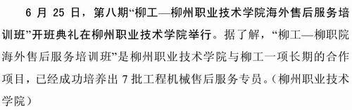 《广西教育信息》2011年第84期发布第八期“柳工-柳州职业技术学院海外售后服务培训班”开班典礼在我院举行的信息。(朱汝群)