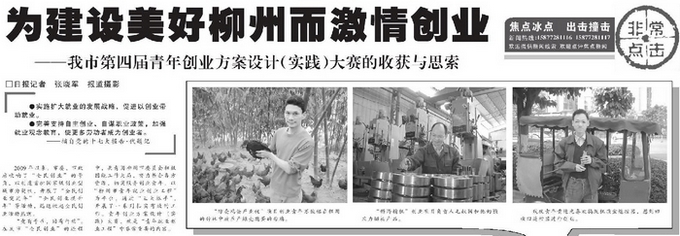 今年6月,由市委宣传部、团市委、市工业和信息化委员会、市商务委、市人力资源和社会保障局、市工商行政管理局、柳州日报社、柳州银行联合举办的第四届柳州市青年创业方案设计(实践)大赛启动。5个多月来,大赛席卷全市18所大中专职技校,覆盖了六县四城区、柳东新区,让6000多名想创业、正在创业的青年参与进来。