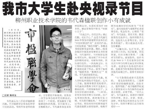 据报道,1月13日,柳州职业技术学院环境监测专业大三学生韦代森踏上赴京行程,参加由央视书画栏目邀请的专题节目录制,引起我市楹联界的关注。报道称,韦代森从大二开始对楹联感兴趣,到市楹联学会参加各种学习交流活动,得到专家老师的指导,文学素质不断提高,在参加一次学会举办的有奖征联活动中,韦代森获得了一个奖项,更加激发了他楹联创作的热情。至目前为止,据粗略统计,韦代森参加全国各种征联活动,所获的奖项有100多件,被业界和同学称为“对联小王子”。(蒋玉梅)