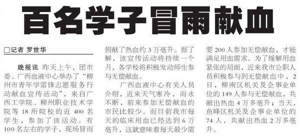 2012年3月4日,《柳州晚报》报道我院学生积极参与无偿献血活动的新闻。