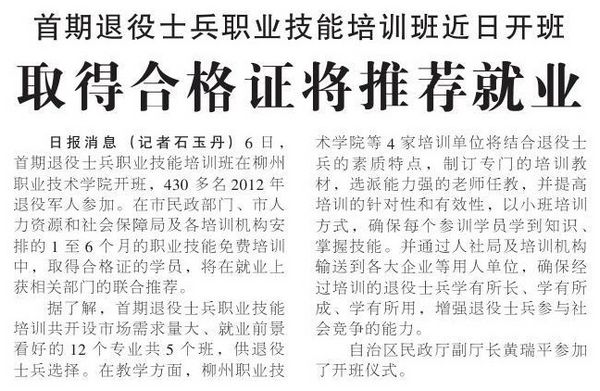 2012年3月9日,《柳州日报》报道首期退役士兵职业技能培训班在我院开班的新闻。