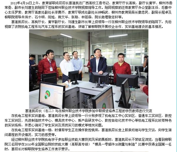 柳州教育局网站发布教育部职成司领导莅临我院视察指导工作的信息 来源:柳州职业技术学院新闻网 作者:崔智慧 编审: 发布时间:2012-04-23 浏览次数: 次 【字体:小 大】 分享到: 2012年4月20日,柳州教育局网站发布教育部职成司领导莅临我院视察指导工作的信息。(崔智慧) 柳州教育局网站发布我院信息截图 关闭 打印正文