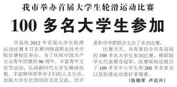2012年5月9日,《柳州日报》报道我院学生在柳州市首届大学生轮滑运动比赛中勇夺冠军的新闻。(蒋玉梅)