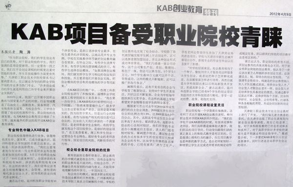 2012年4月9日,《中国青年报》报道我院灵活开展KAB创业教育课程的新闻。(蒋玉梅)