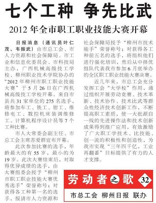 2012年5月29日,《柳州日报》报道2012年柳州市职工职业技能大赛在我院分赛场举行的新闻。(蒋玉梅)
