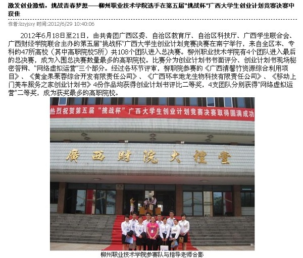2012年7月4日,柳州教育局网站发布我院选手在第五届“挑战杯”广西大学生创业计划竞赛决赛中获佳绩的信息。(崔智慧)