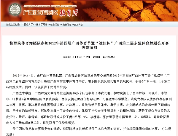 2012年10月11日,广西教育厅网站发布我院体育舞蹈队参加2012年第四届广西体育节暨“达佳杯”广西第二届东盟体育舞蹈公开赛满载而归的信息。(崔智慧)