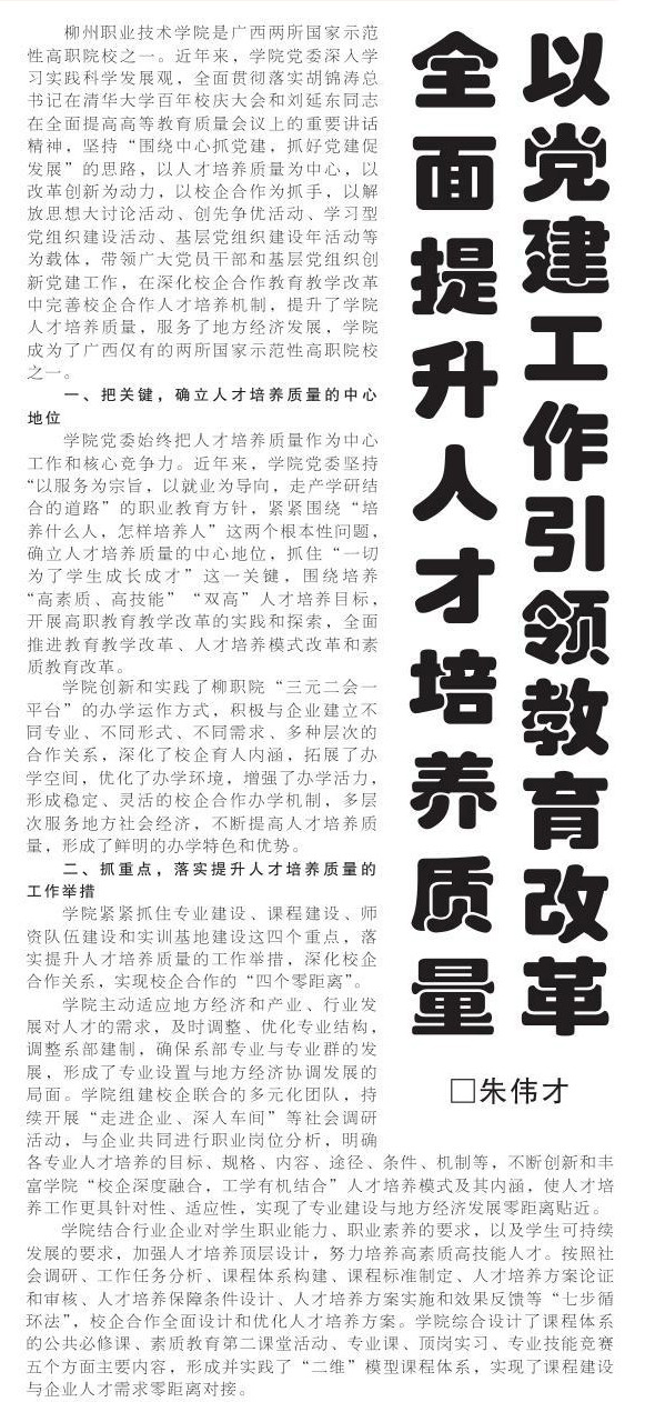 柳州日报第5版“论苑”刊发我院党委书记朱伟才教授的理论文章 来源:柳州职业技术学院新闻网 作者:崔智慧 编审: 发布时间:2012-10-30 浏览次数: 次 【字体:小 大】 分享到: 2012年10月30日,柳州日报第5版“论苑”刊发我院党委书记朱伟才教授的理论文章《以党建引领教育改革,全面提升人才培养质量》。 (石玉丹) 新闻截图 关闭 打印正文